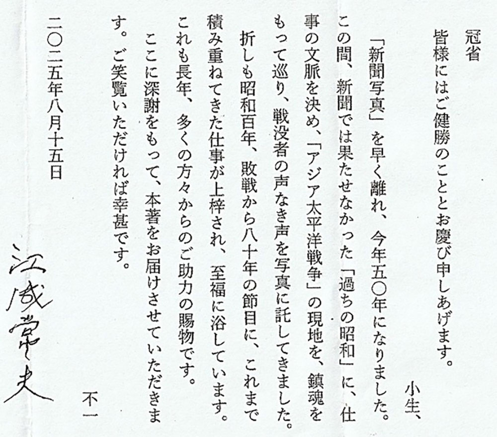 毎日新聞OBの写真家・江成常夫さん(89歳)から伊藤俊治著『昭和百年への鎮魂—江成常夫のレンズがとらえた戦争』(集英社新書ビジュアル版)が送られてきた。