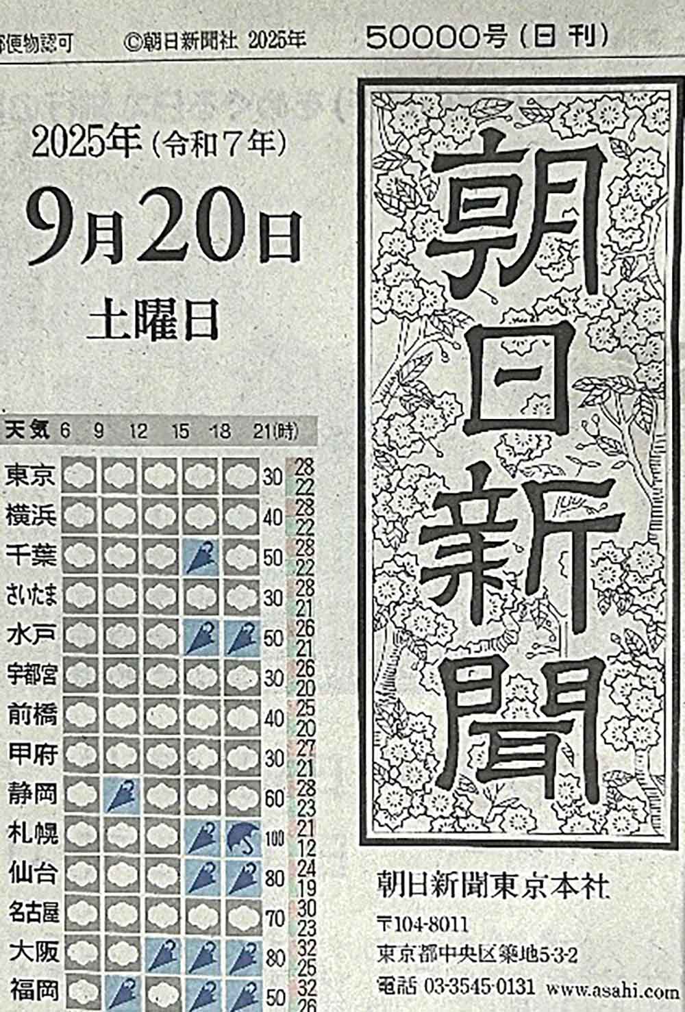 朝日新聞の東京本社発行版が、9月20日付けで5万号を達成した。
