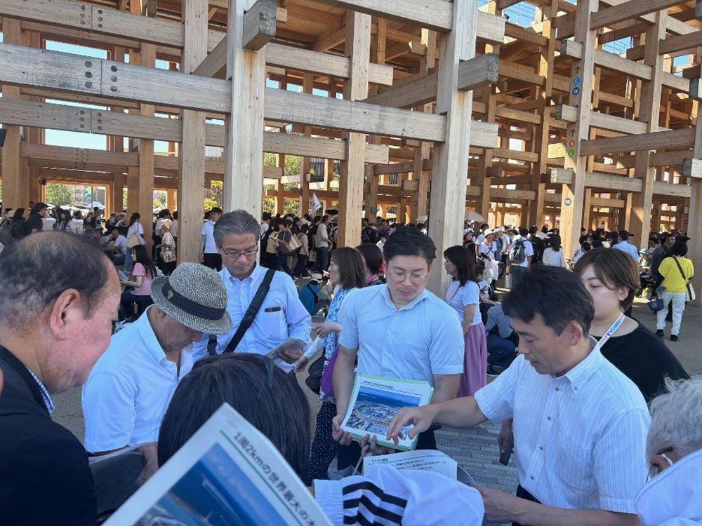 会場へ行く前に大阪木材会館で博覧会協会の永見靖持続可能局長、大阪府木材連合会の三宅英隆専務理事、中川木材産業㈱(本社堺市)中川勝弘社長からレクを受けた。