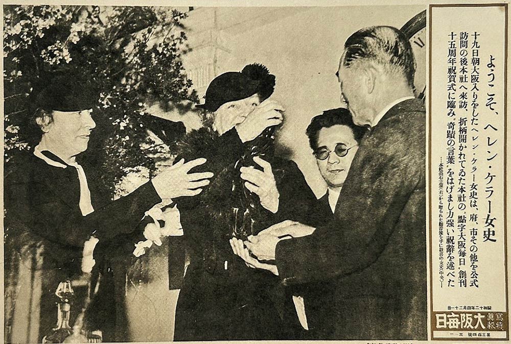 ヘレン・ケラーさんは、1937(昭和12年)4月訪日。4月19日「大毎」(大阪毎日新聞)本社を訪れ、「点字毎日」創刊15周年の式典に出席した。「力強い祝辞を述べた」と説明にある。右端は高石真五郎主筆。