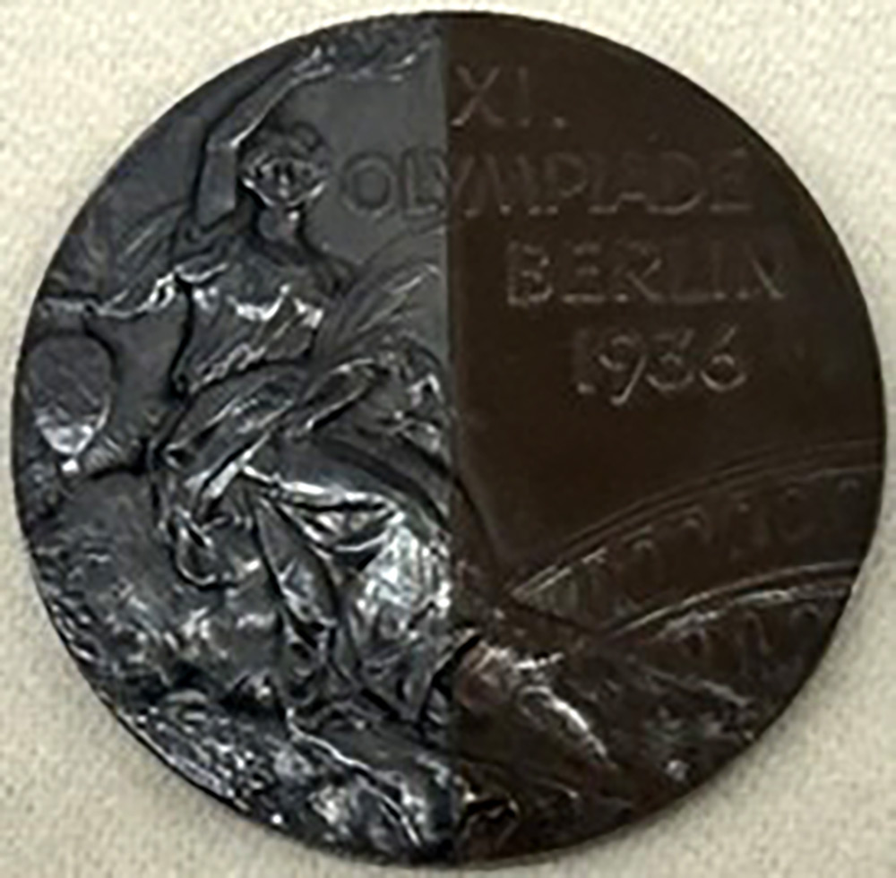 棒高跳びは、4㍍25の記録で西田修平・大江季雄両選手が2・3位に入った。1回目でクリアした西田に銀メダルが贈られたが、帰国後、メダルを半分に切って繋合わせ「友情のメダル」となった。参考までに大江選手所有のメダル。